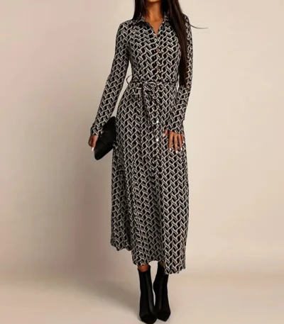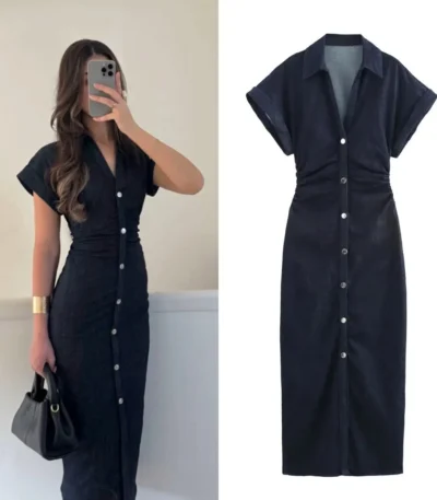 Denim Midi Dress Lapel Side Zipper Slim Waist