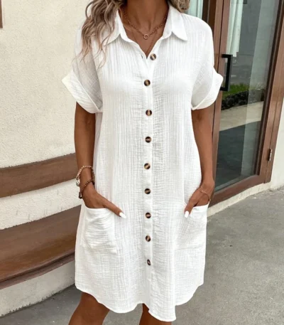 V-Neck Cotton Linen Mini Dress Three Quarter Sleeve