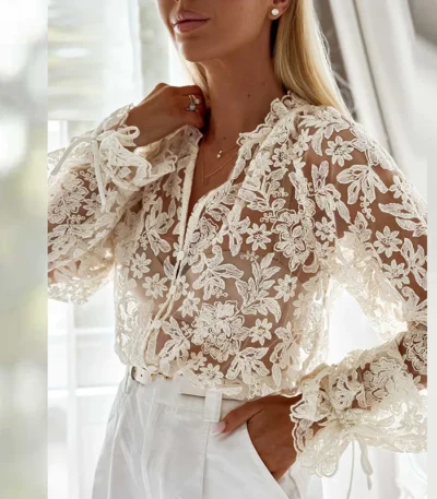 Lace V-Neck Long Sleeve Blouse Spring Vacation Top
