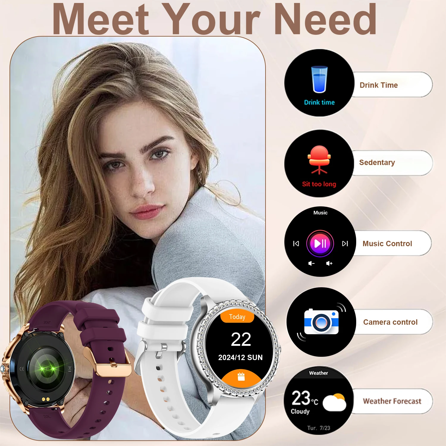 【Luxury Design】: The smart watch for women features a 1.32" HD touchscreen.Indulge in the exquisite craftsmanship of our diamond-studded smartwatch, featuring a gold-plated stainless steel frame , a dazzling diamond-studded bezel and a stainless steel band with embedded diamonds. Each detail is meticulously designed to offer a luxurious and sophisticated look, making it a standout piece in any collection.