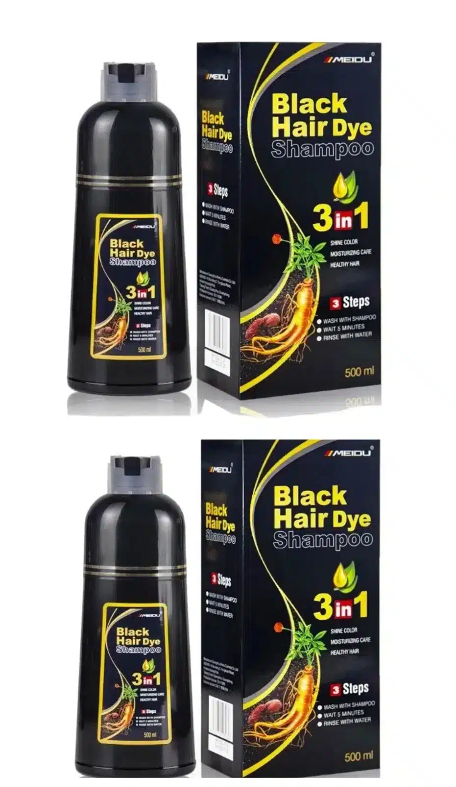 2 Bottles of Black Hair Color Shampoo 3 in 1 +100% Grey Coverage