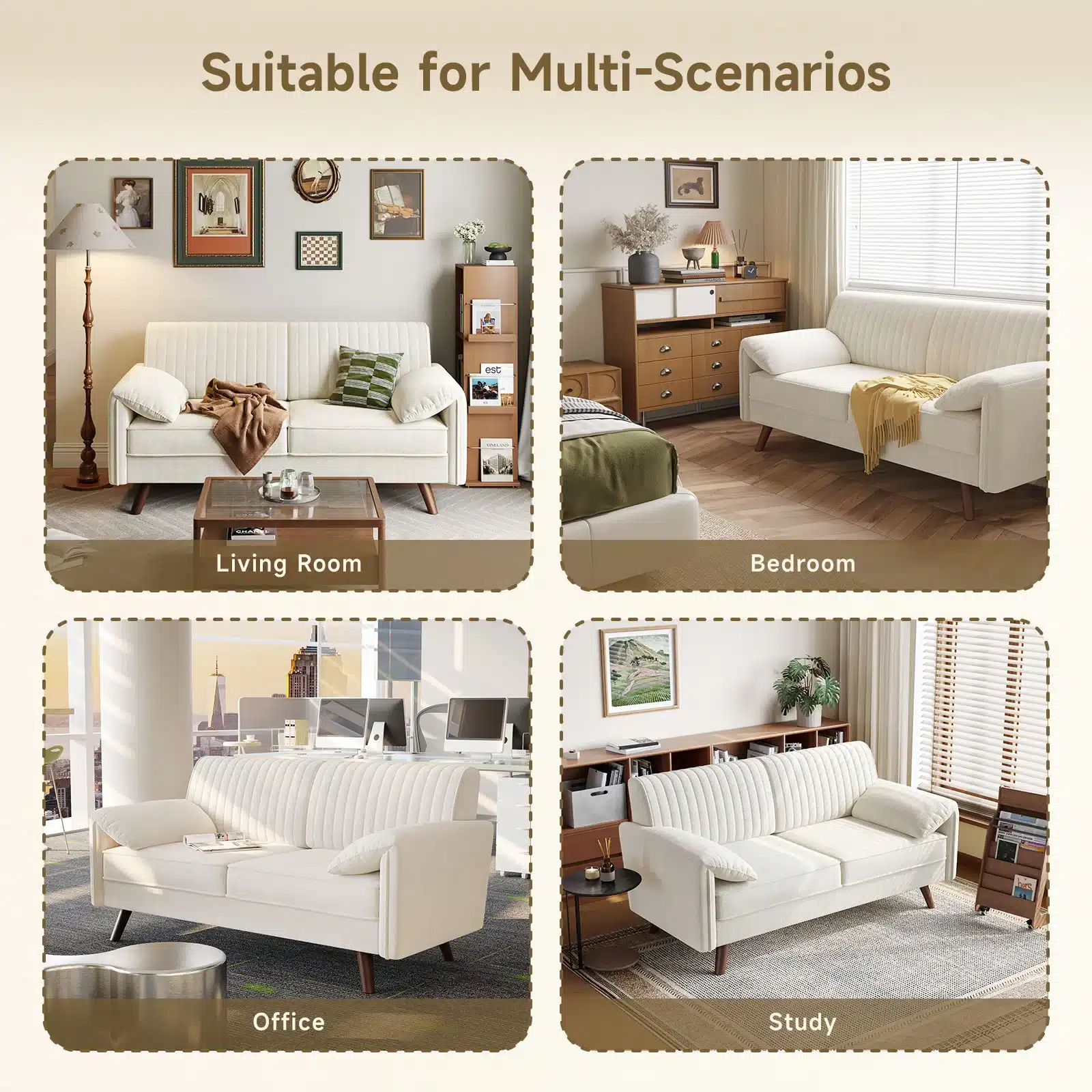 Measuring 64.5" W x 31.8" D x 33.2" H, this compact loveseat sofa (also perfect as a couch) features padded arms and a clean minimalist silhouette. Ideal for living rooms, offices, bedrooms, dorms, or small-space couch setups.