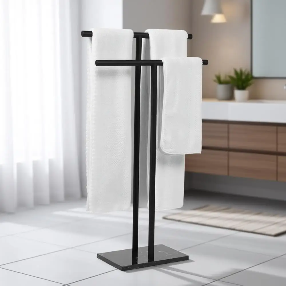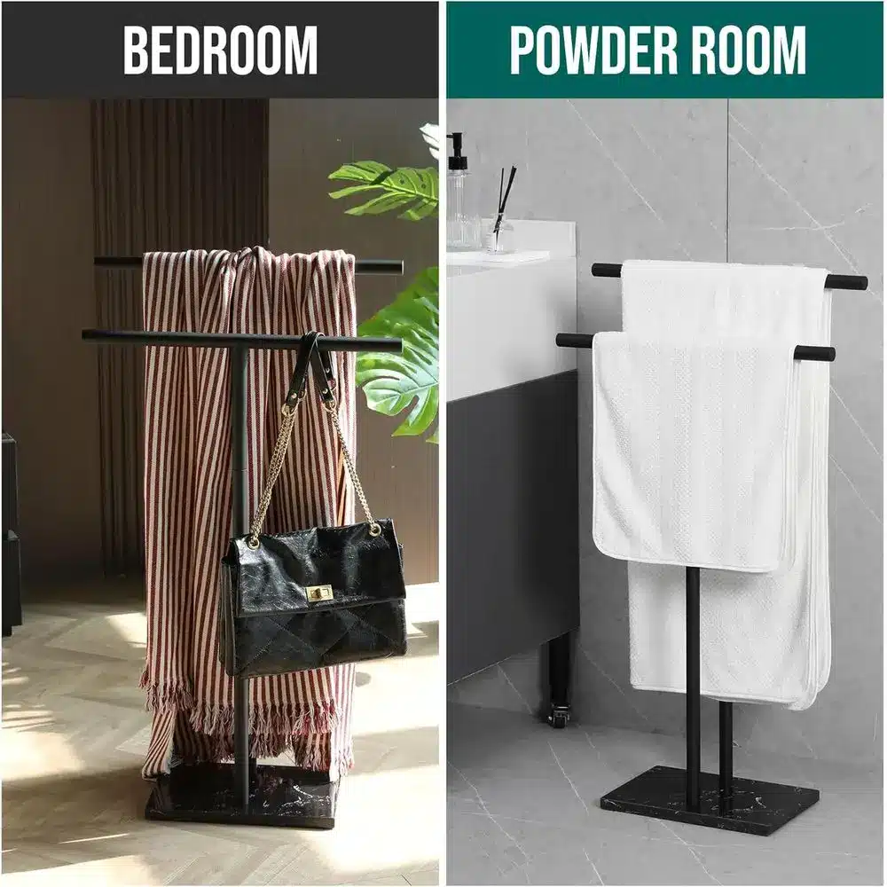 T Shape Design – Matte Black inish, the unique double T shape design o this reestanding towel rack or bathrooms allows or easy accto towels rom both sides, mg it a perecnvenient or multiple users with many towels o dierent shapes and sizes. Designed speciically not to swivel and stay in place once assembled! With lat rounded edges makes it easier to pull towels o without getting caught!