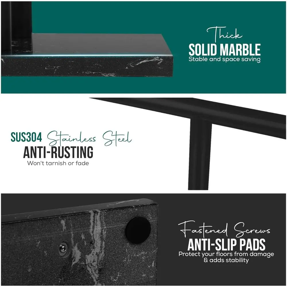 Heavy Marble Base – Gloss black inish with white veining, the heavy marble base not only adds stability to this 2-tiered towel rack, but balanced perectly this prevents the towel stand rom tipping or wobbling when pulling towel sheets o. Marble enhances the overall aesthetic appeal, it’s a perect combination o unctionality and style!