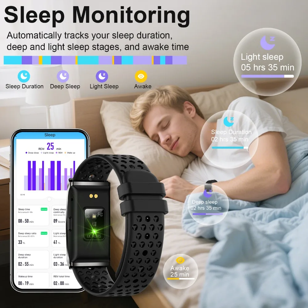 【All-Night Sleep Tracking】Smart wristband with 24/7 sleep monitor. Tracks nighttime sleep + daytime naps, records wake-up time, total sleep duration & sleep stages (light/deep/REM). Adjust rest schedule with sleep pattern insights.