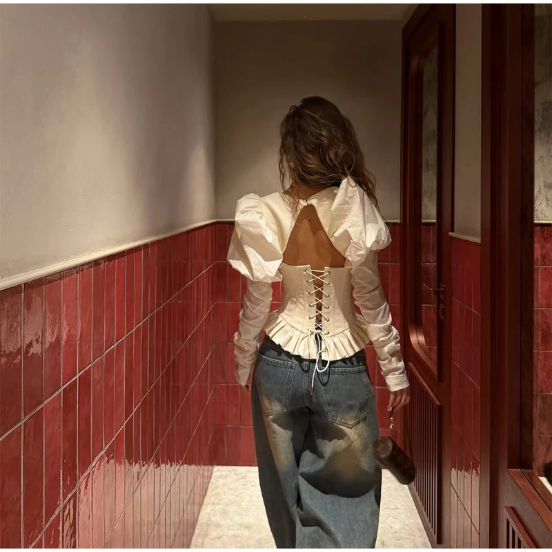 Square Neck Puff Sleeve Backless Blouse Club Party Top
