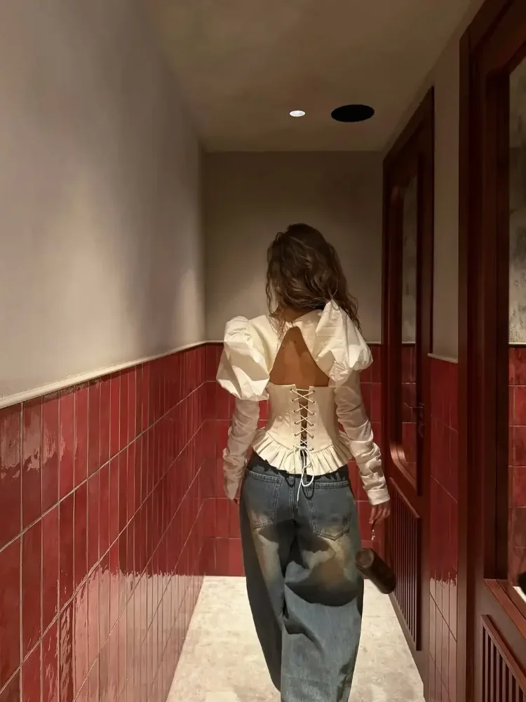 Square Neck Puff Sleeve Backless Blouse Club Party Top